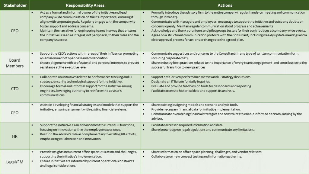 - Stakeholder mapping and engagement plan across leadership and delivery roles